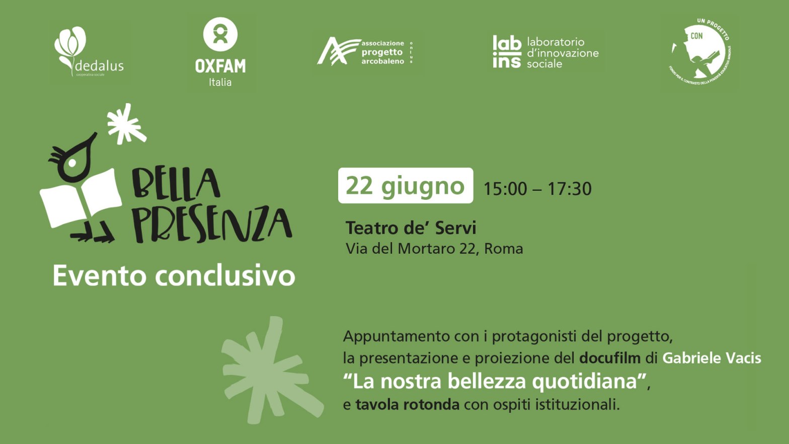 Evento conclusivo del progetto “Bella presenza” 22 giugno, ore 15:00-17:30 Roma, Teatro de’ Servi, via del Mortaro 22 Trovate qui tutte le informazioni necessarie. Si può comunicare la propria intenzione di partecipare in presenza attraverso l’apposito link su Fb Qu di seguito si allega la locandina in pdf dell’evento